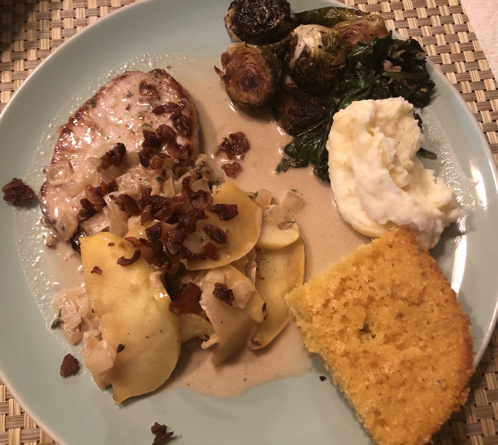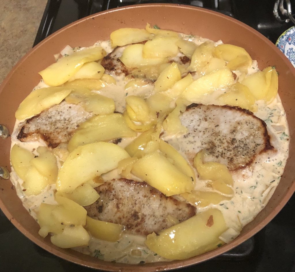 After scooping out the pancetta, she cooked the pork chops, removed them, then fried the yellow apple slices, removed them, then added spices, followed by bourbon and heavy whipping cream. Once the sauce had formed, she reintroduced the chops and apples into the skillet. Quite a beautiful show to behold and wonderful to partake.