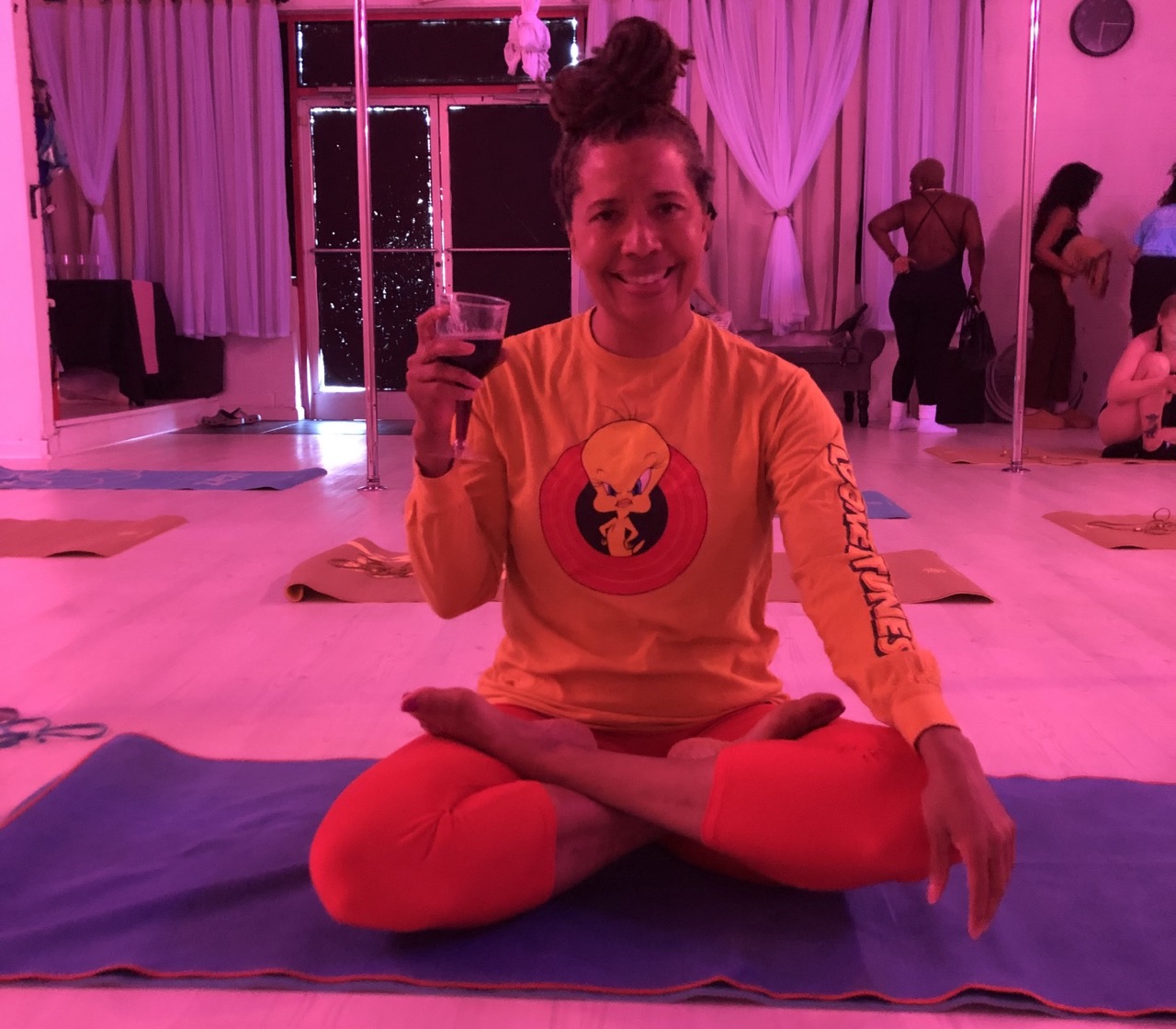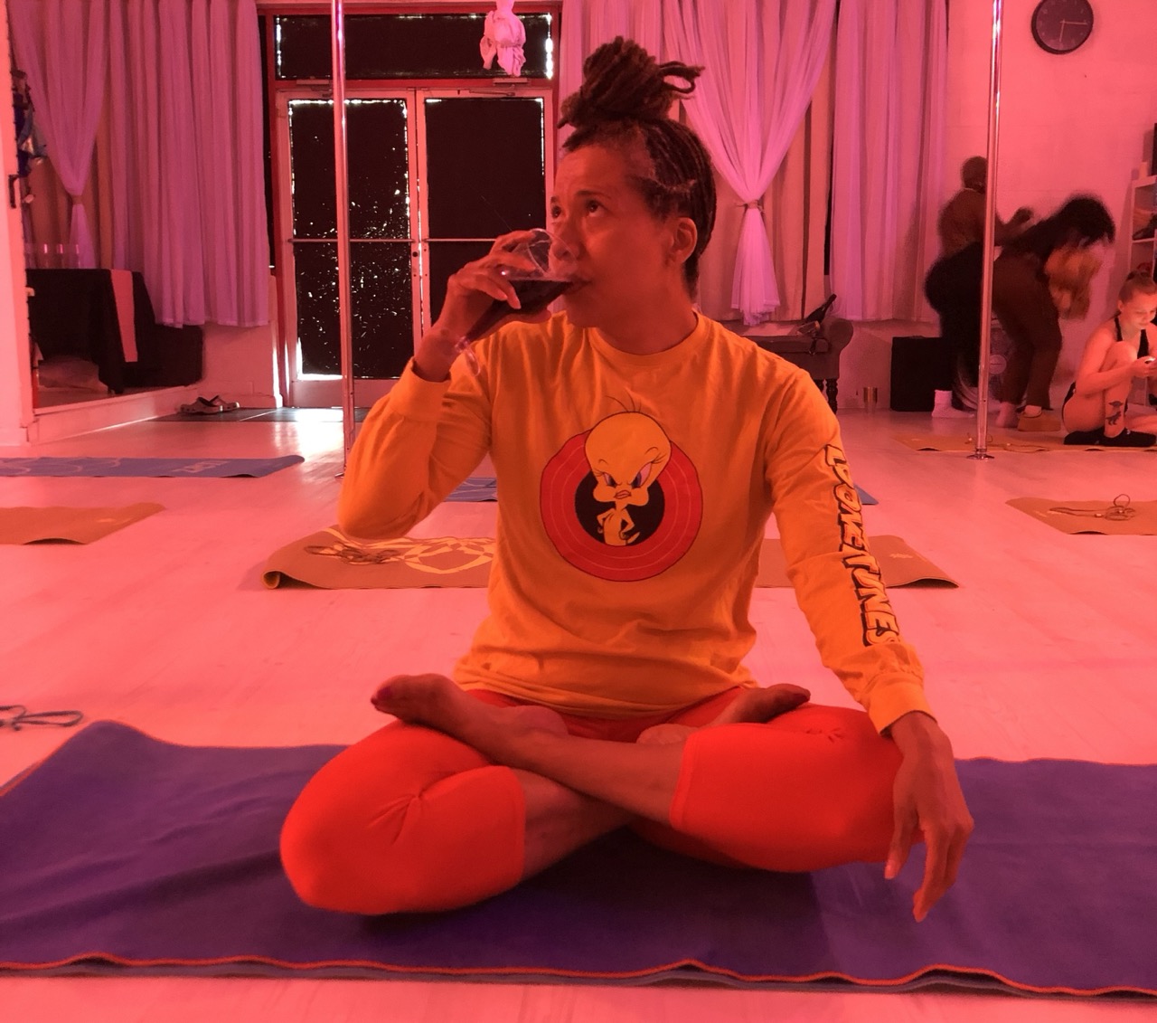 Normally, I don’t drink before a workout, but the whole point of this Friday stretch class was to combine happy hour with fitness. I’d had a “detox/retox” experience before, but never simultaneously!