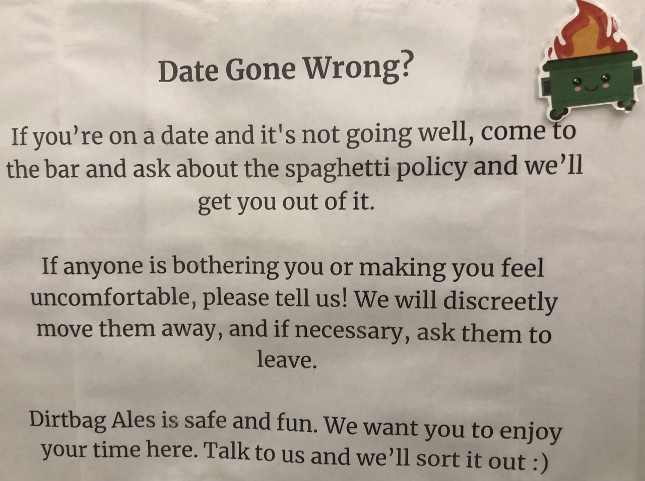 After I finished eating, I went to the bathroom to wash my hands when I noticed the “Date Gone Wrong” sign. I loved everything about it. A part of me felt sad that women needed such a plan B, but I was very happy that there were strategies to help a sister out. A woman’s safety shouldn’t be compromised just because she’s looking for romance. Ideally, she’d be as happy and secure as the woman behind me in the food line.