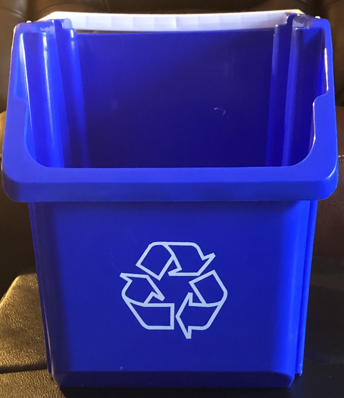 In my latest attempt to go greener, I bought a pair of blue recycling bins with handles, one for the kitchen and one for my bedroom. Previously, Mom had used a white TRASH BAG-LINED tall kitchen receptacle to put our recycling in. Whenever it was full, she’d close up the bag and toss it in the outdoor recycling bin. [NOTE: Before Dad starting receiving 48-hours a week in caregiver services, I used to properly take out the recycling by dumping the recycling out sans trash bag and reusing the bag until it was no longer usable, THEN tossing the bag into the outdoor garbage bin. Now, it’s the caregiver’s job, whenever Mom cares to ask them to do it.]