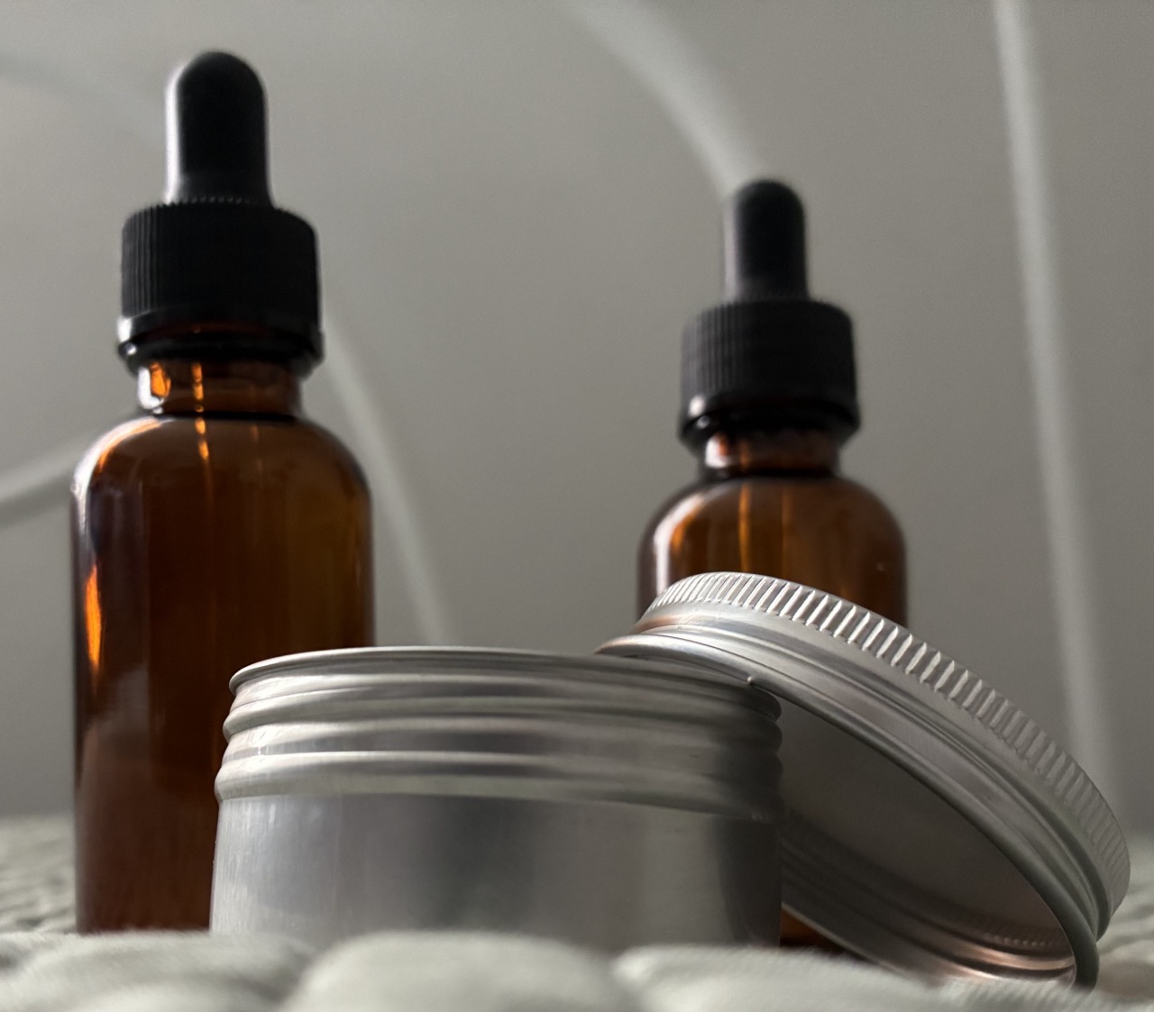 So, I bought two amber dropper bottles, one for the CBD and the other for CBG, and a metal tin for the CBD topical. I want to be lowkey about the whole thing.