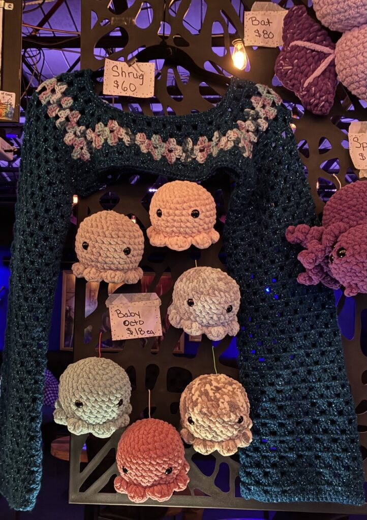 Although I was only there to check out the weekly event and possibly buy a leather fanny pack, I loved the shrug. One of my nieces had taken up knitting during COVID, a hobby that she’s continued. I’ve seen her blankets, sweaters and scarves. A shrug might be an exciting new knitting avenue for her.
