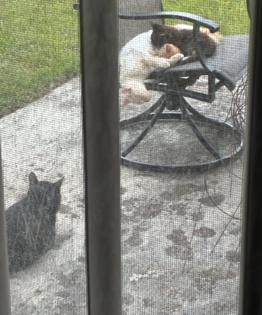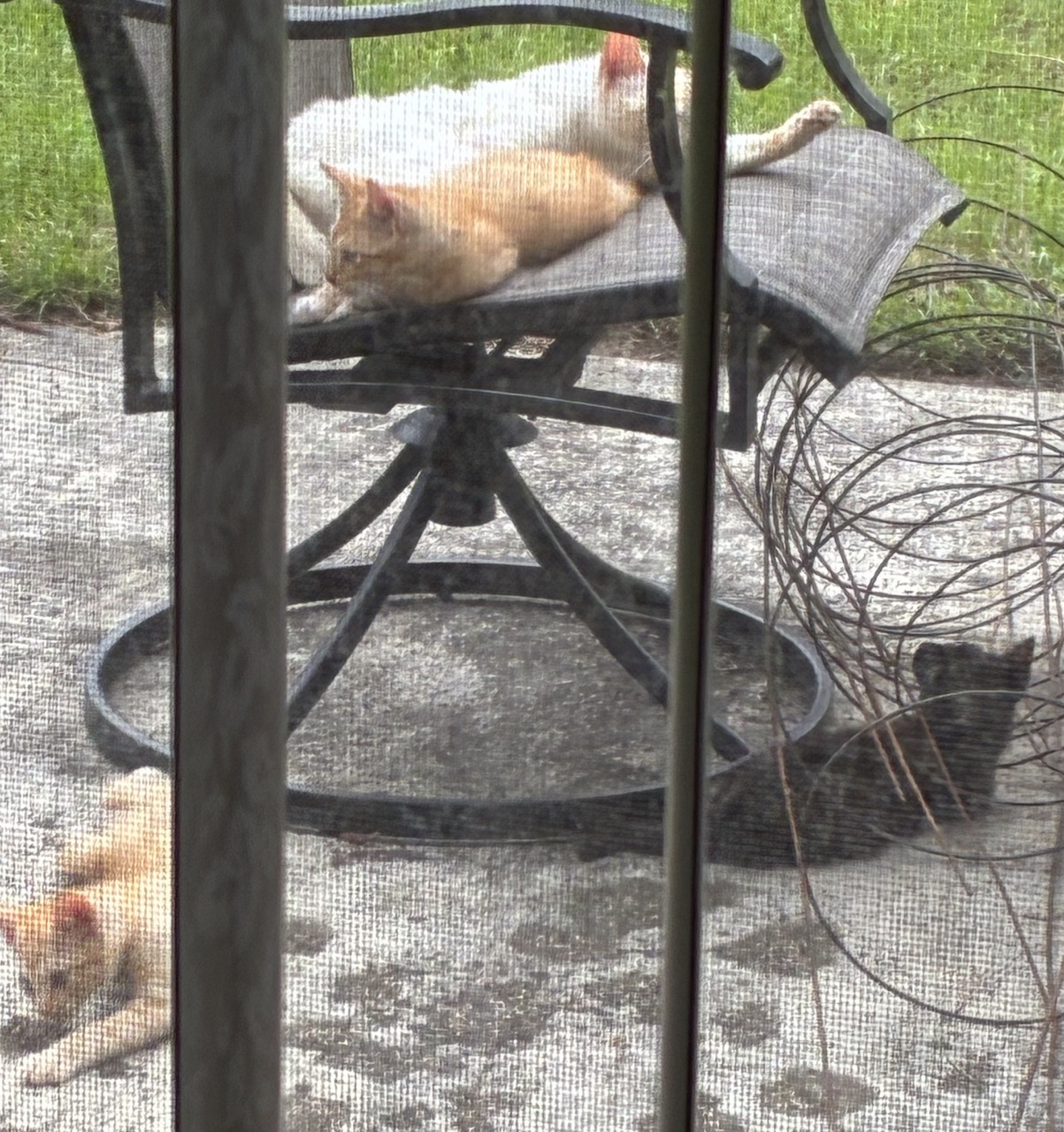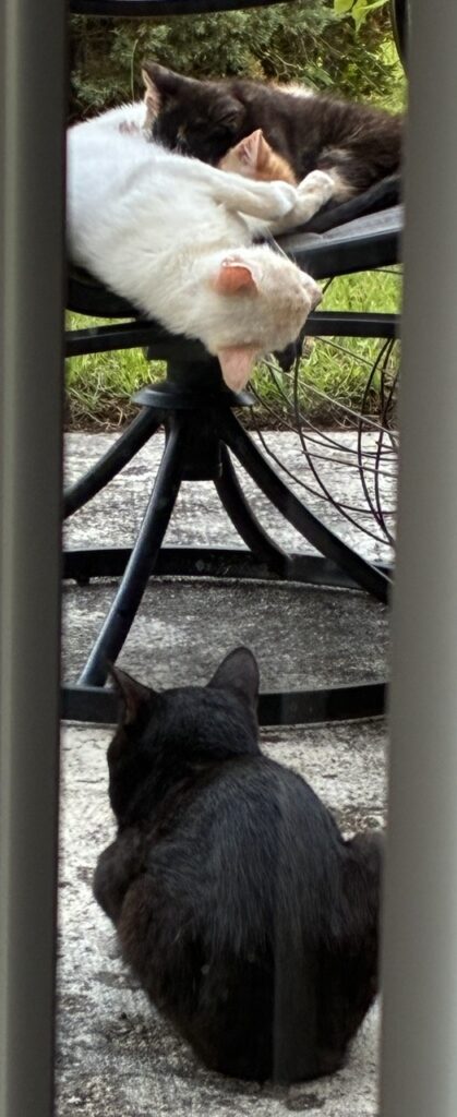 The former science teacher in me wonders what other critters their presence keeps away. Although raccoons tend to be larger and more aggressive, these feral cats have the agility advantage and perhaps the numbers as adults. I’d love to think that our patio cats are keep predators away.