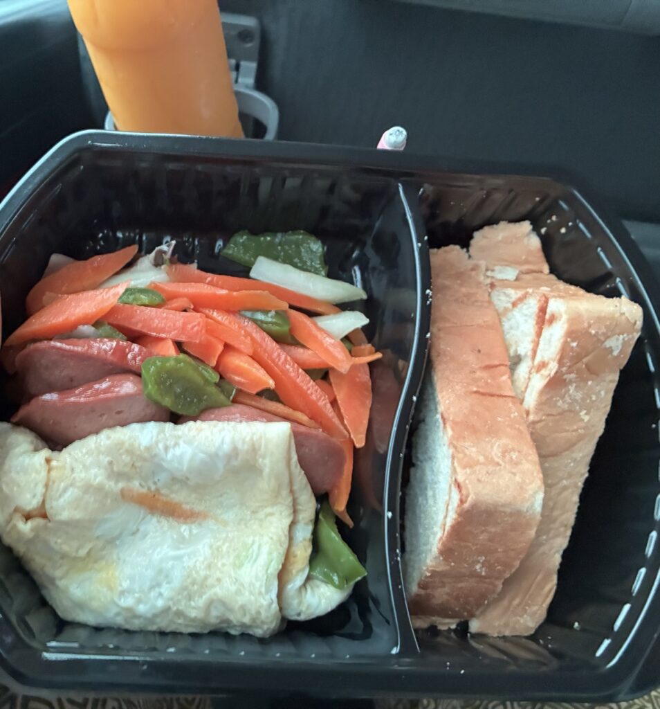 We didn’t have a morning walk nor a formal breakfast since we traveled this morning. Staff passed out bags of breakfast that included mango juice, dragonfruit, pineapple and watermelon slices, an omelette, bread, onion/green bell pepper/ carrot mix, oatmeal, brown sugar packet, tea creamer packet, one slice of toast, cut diagonally.