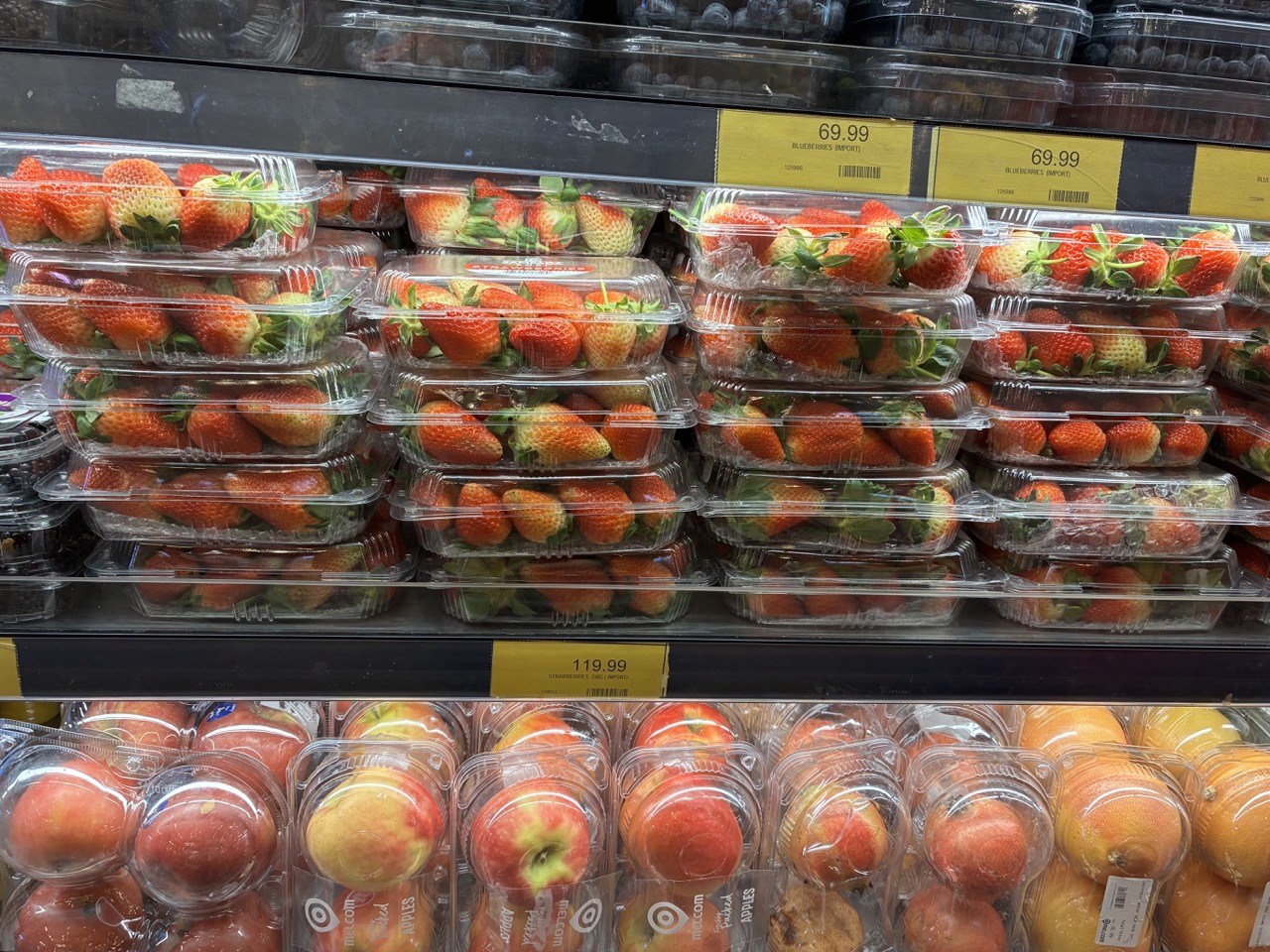 For the first time ever, I saw fresh strawberries. Cost nearly a whopping $12 a carton. A picture was all I took, but someone must be wealthy enough to enjoy that luxury fruit.