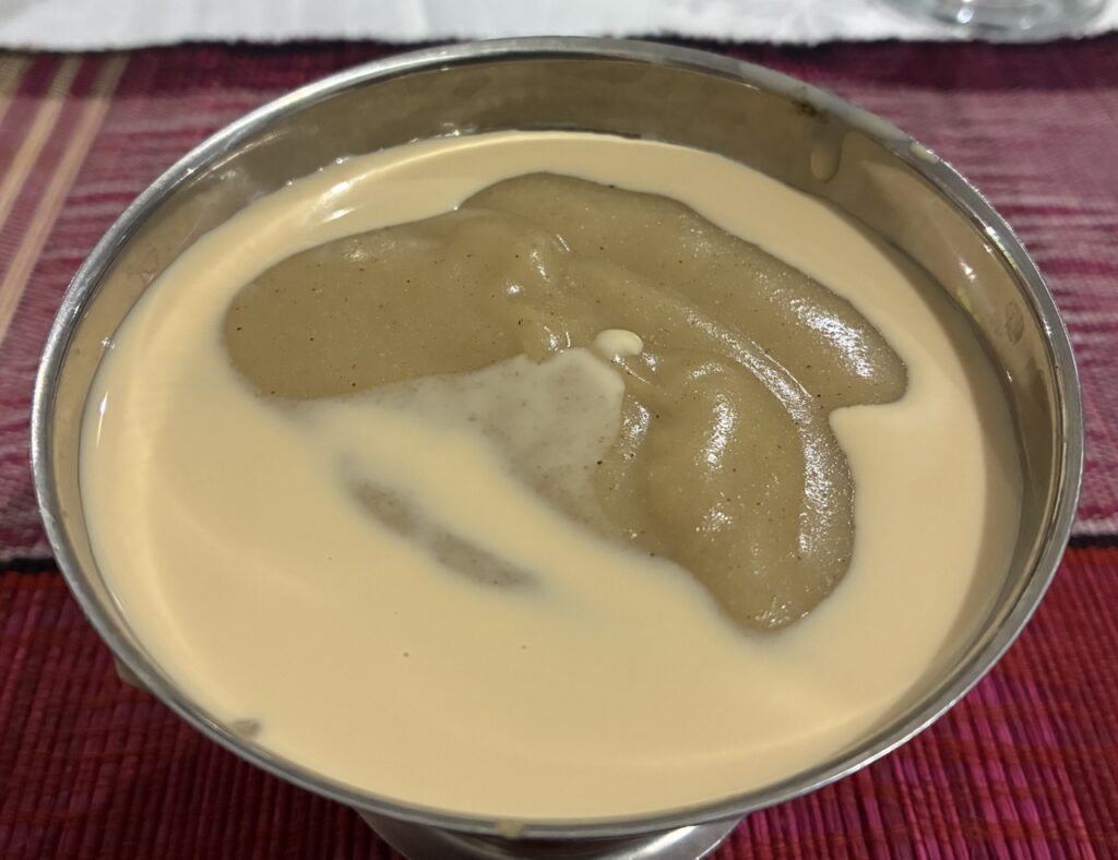We returned to Lizori’s Place for dinner. Our appetizer consisted of spicy sweet groundnuts. Yet, the atadwe milk (tigernut pudding) was the intriguing dish of the evening. Made with tigernuts, dates and rice, the pudding straddled the line between a sweet and a savory.