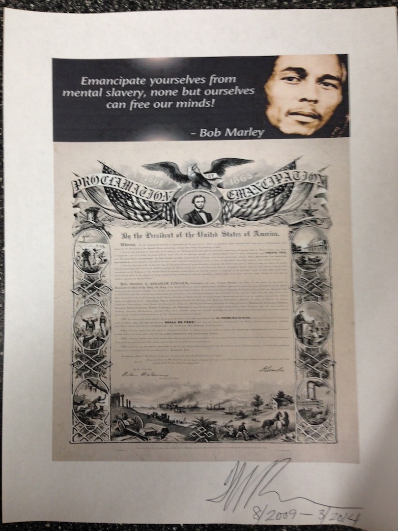 Before I could turn in my things, I spotted the principal. I’d left my “resignation letter” in his mailbox earlier that morning. I retrieved it and handed it to him in person. It featured my favorite Marley quote (Emancipate yourself from mental slavery, none but ourselves can free our minds) and a copy of The Proclamation of Emancipation. I’d signed at the bottom, complete with the date of my employment: 8/2009–3/2014. He burst out laughing. I smiled, shook his cool clammy hand and dashed away to finish checking out.
