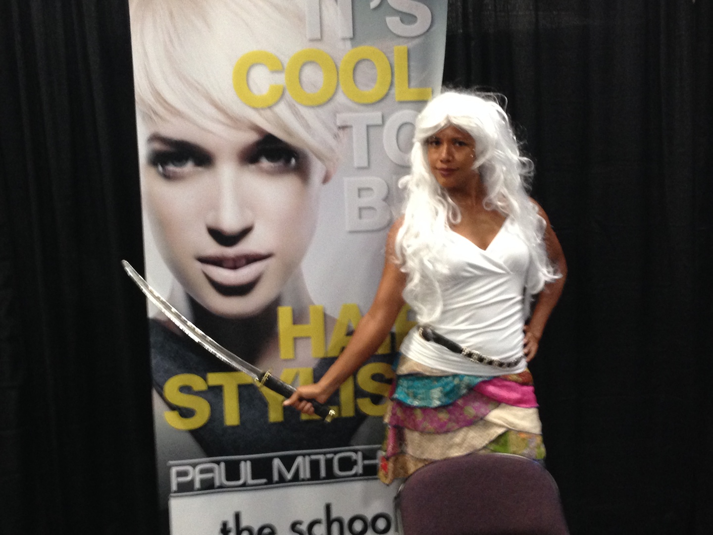 I made the leisurely drive down the street to the second poetry venue. As soon as I walked in, still discombobulated from the sweltering poetry by the pool, a group of people added to my confusion by telling me, “Your troupe just went that way.” Considering the fact that I’d arrived much earlier than I’d told any of my poets to be there, I was quite sure “my troupe” hadn’t entered the building yet. When I went to the bathroom to freshen up, that’s when I discovered the futuristic hair and clothing models. After freshening up, I posed with their sign.