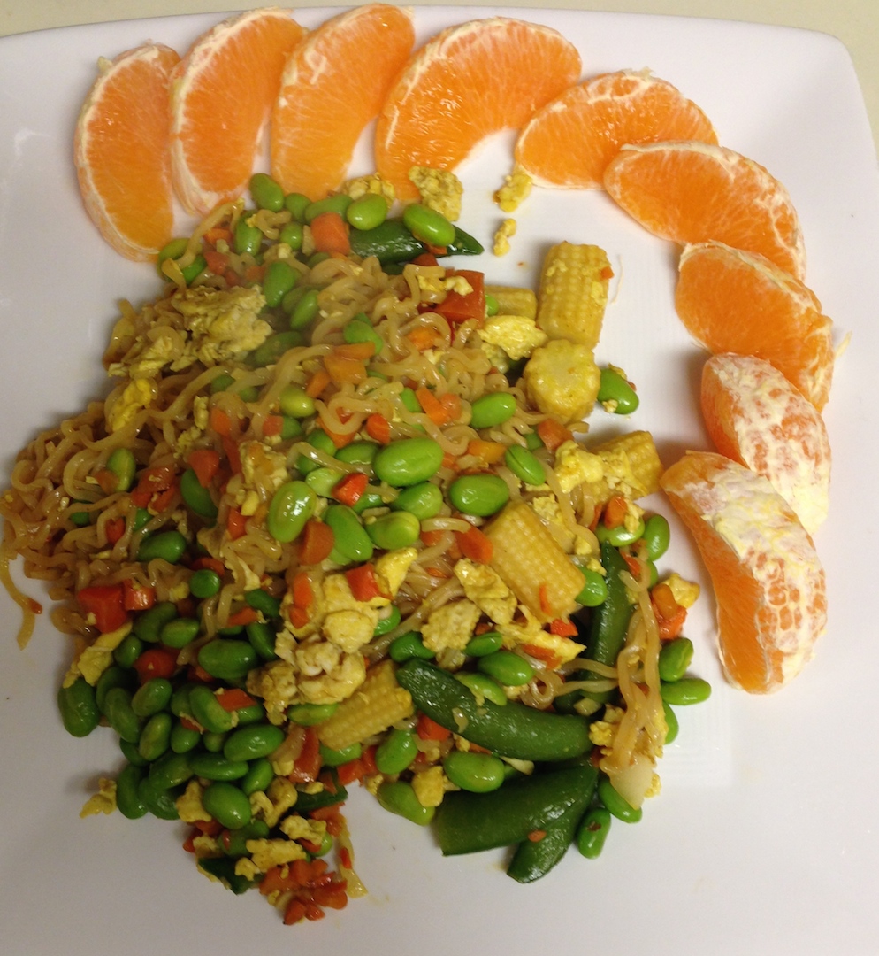 For this version, I used frozen Asian vegetable mix with baby corn, edamame, red peppers and string beans and of course a scrambled egg. The orange slices frame the meal as a dessert.