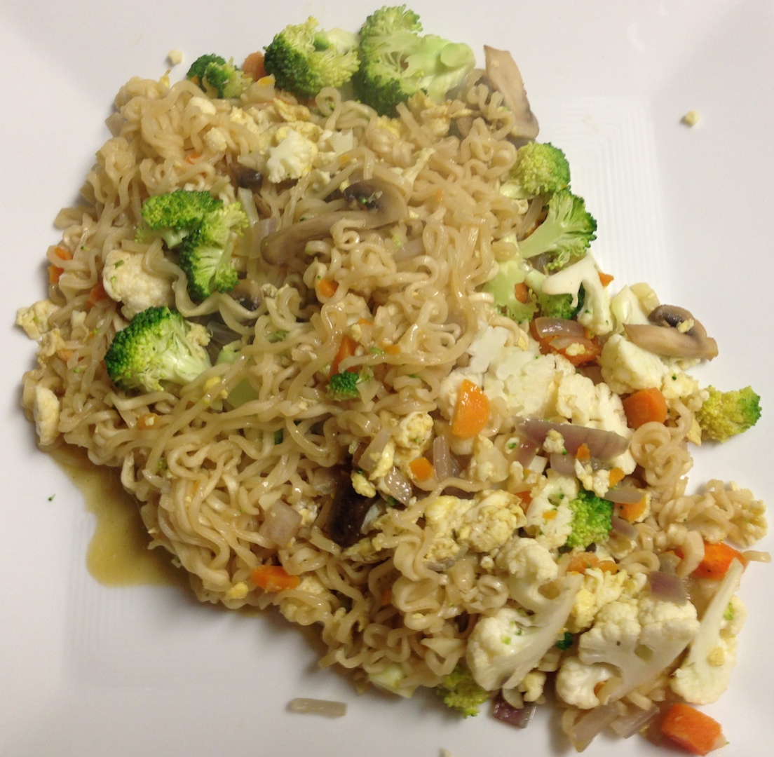 Rediscovering that inexpensive college favorite, ramen noodles, has been an amazing culinary journey. I started quite innocently sautéing garlic, red chilies and red onion in extra virgin olive oil (EVOO). Then I scooted them to the side, cracked an egg and scrambled it quickly with a wooden spoon until it was beautifully fluffy. Next I doused the skillet with a glass of water, turned the dial from “medium” to “high,” dissolved the flavor packet, brought the water to a boil and added the noodles.