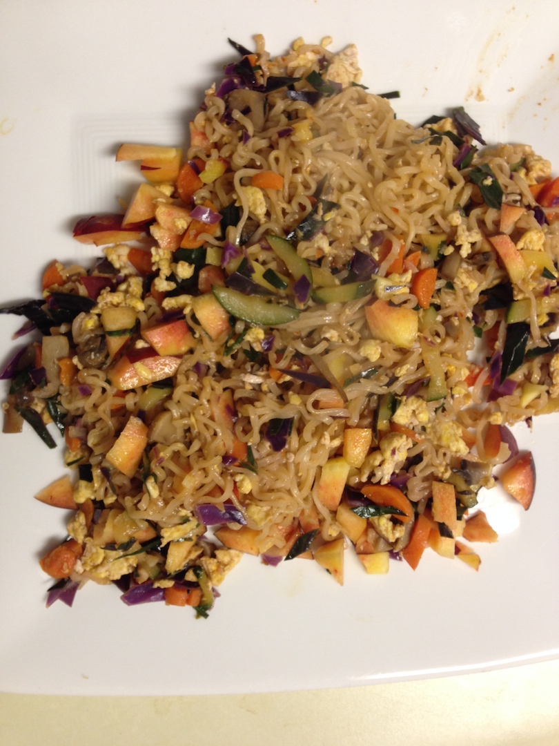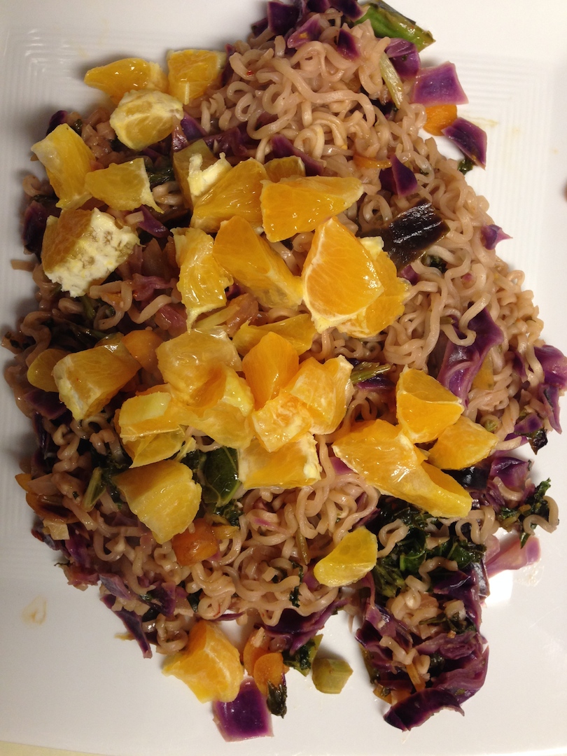 Around this time, small Texas peaches were in season. I love how their color contrasts with the red cabbage.Yes, another picture with red cabbage…a lesson learned: buying even the smallest head of cabbage means I’ll be eating it for nearly a month! I originally bought it to make a curried vegetable stir-fry for a potluck, but only ended up using about 1/4 of it for that delicious dish. Not that I’m complaining. I’ve had a wonderful time putting it in many other dishes along with my ramen noodle 2.0 creations, especially with these chopped navel oranges.