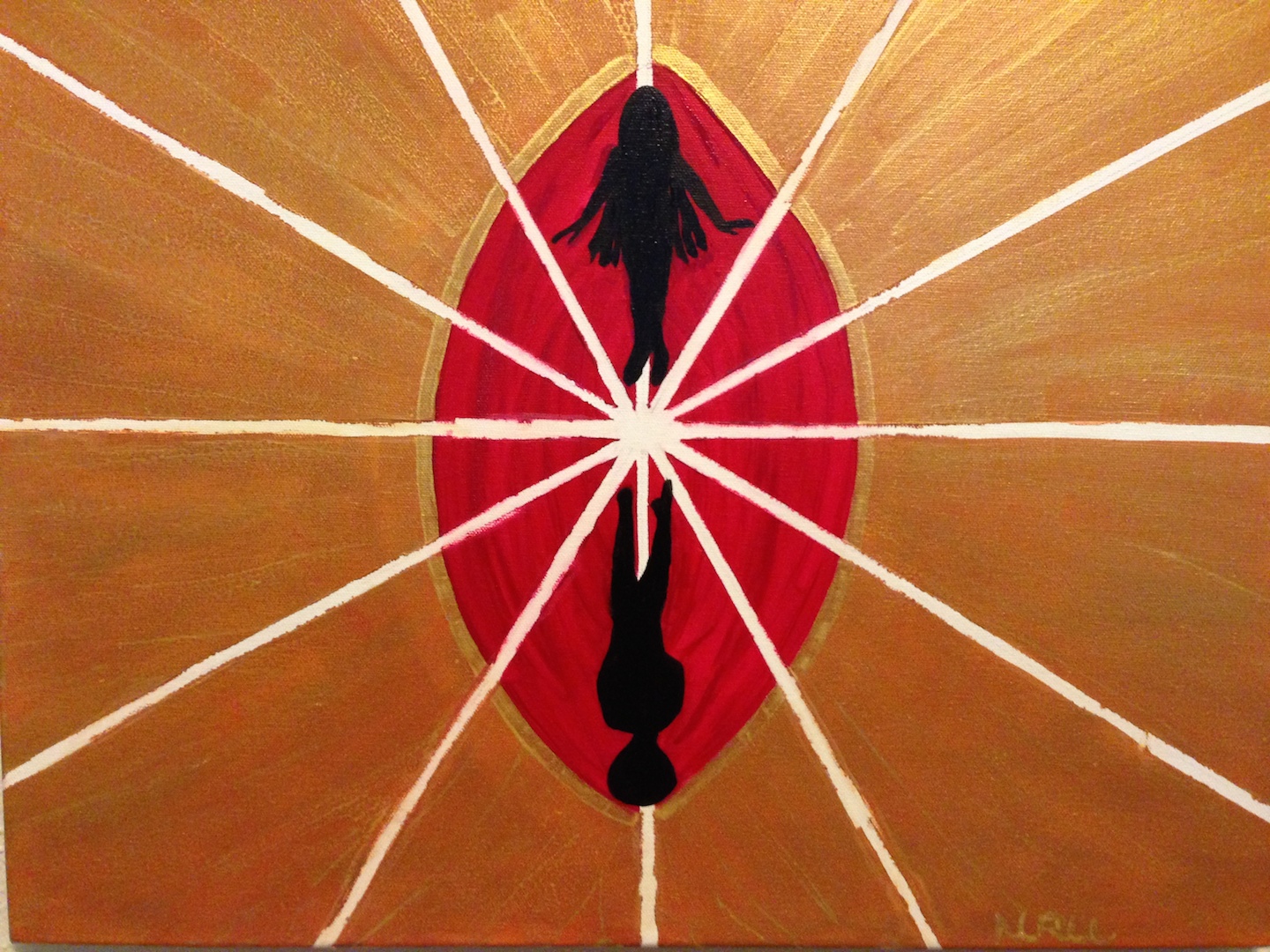 This painting comes from chapter 14 of my second novel, The Adventures of Infinity and Negativa. At the end of the previous chapter, the main character, Nuru, has just drowned in the Caribbean Ocean, off the coast of Honduras while attending a 24-hour, underground music beach party. The title characters, Infinity and Negativa are twin fantasy mathematical sisters who reside in Nuru’s head. The twins, who always start off every chapter, experience, debate, and riff their own scenes based on Nuru’s reality. In this painting, only their silhouettes are shown. Infinity has the waist-long dreadlocks and Negativa wears an Afro.