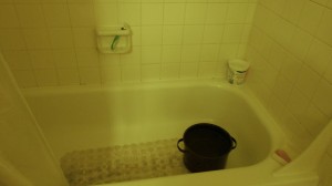 As wonderful as my Thanksgiving vacation was, I celebrated every day without a drop of hot water running through my faucets! Once again, my Peace Corps experience helped me out. The two and a half years that I volunteered in Tanzania, I had to warm up my water and take a bucket bath. Here’s my “developed” country version of a bucket bath: