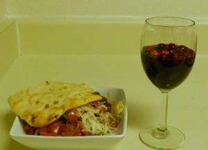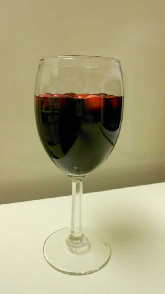 During my programed life, I normally go grocery shopping on Thursdays, but since that was actually Thanksgiving day, I figured I’d avoid the crowd and go on Wednesday. Apparently, the crowd had the same idea. As packed as the parking lot was, there wasn’t a scarcity of food nor long lines at the checkout. Then again, the only traditional Thanksgiving item I bought was a bag of fresh cranberries. They looked so richly red that I could hardly resist. Too bad I didn’t realize that all the cranberries I’d ever eaten were artifically sugared. Those berries were the sourest things since my ex-boyfriend’s kisses. But I was determined not to waste my money. So I garnished my wine glass with cranberries. Absolutely beautiful, but they would have had to soak for a much longer time that it takes me to consume a glass of wine in order for the berries to absorb the wine.