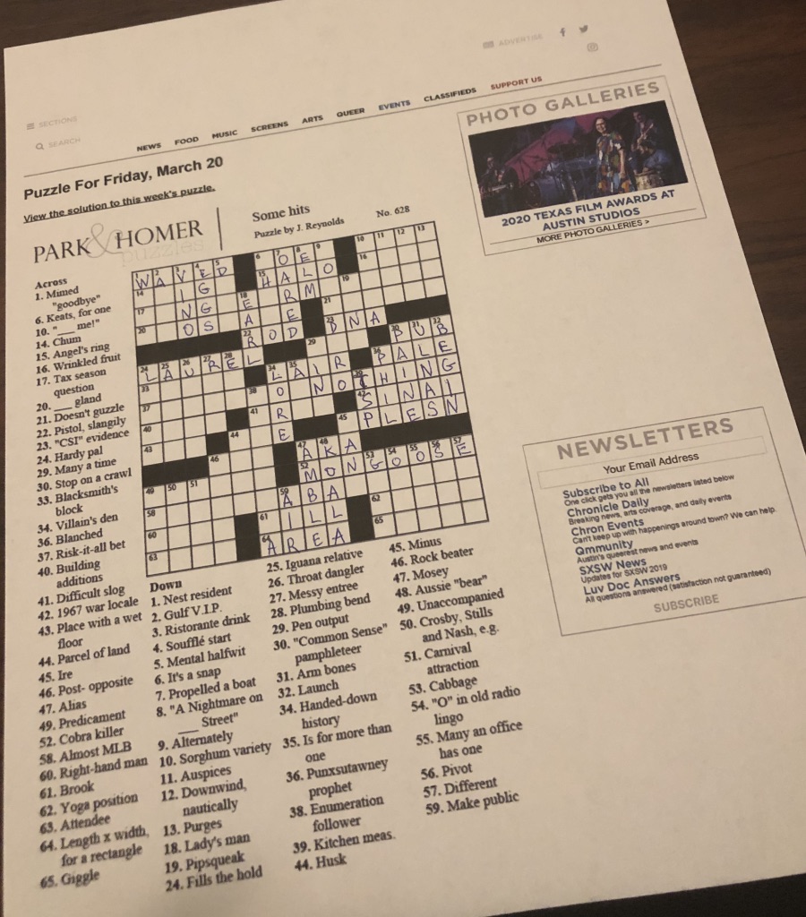 (Yes, I always do it in pen!) I wasn’t about to go out just for the joy of getting the free weekly paper. My pre-pandemic weekly routine would have taken me near a stand to get that paper. I downloaded and printed it out instead. Not nearly the same experience, but it sufficed.