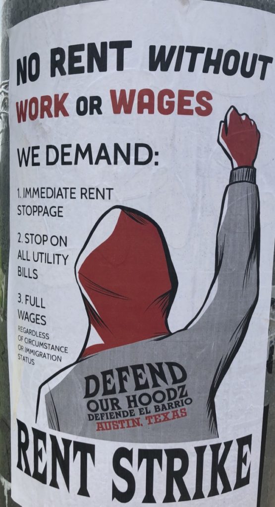 I came across a rent strike poster. The City of Austin hadn’t yet declared an anti-eviction policy. During this time, even the federal government was still debating about a one-time payment to select Americans. Some politicians even wanted the country to reopen by Easter rather than provide monetary assistance to furloughed Americans.