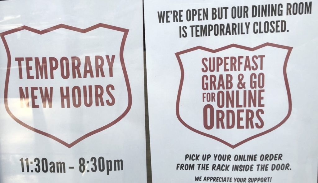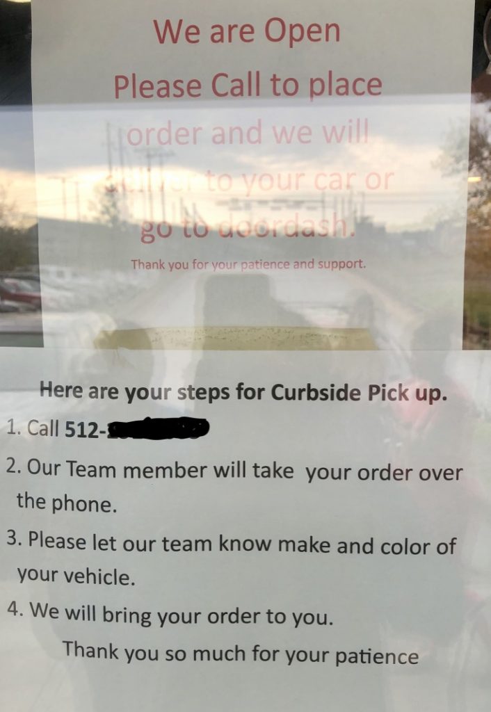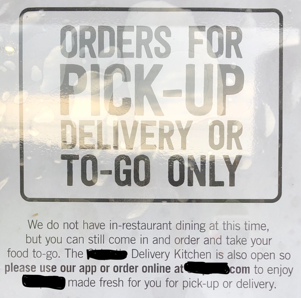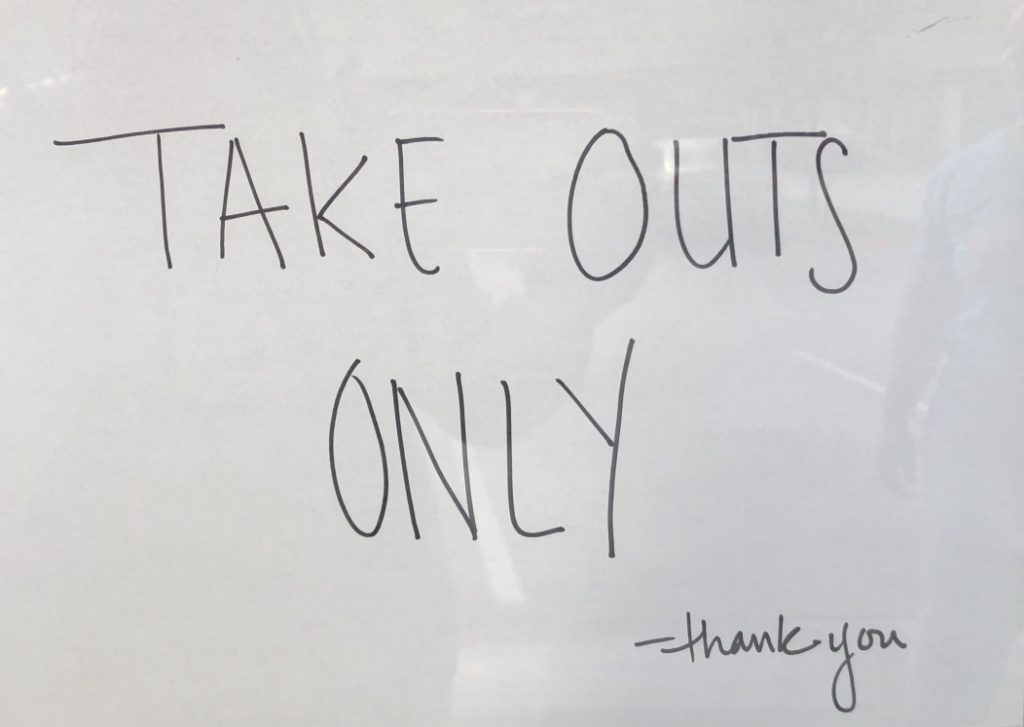 According to the various signs that had cropped up like spring rain mushrooms, the only two options were delivery or takeout.
