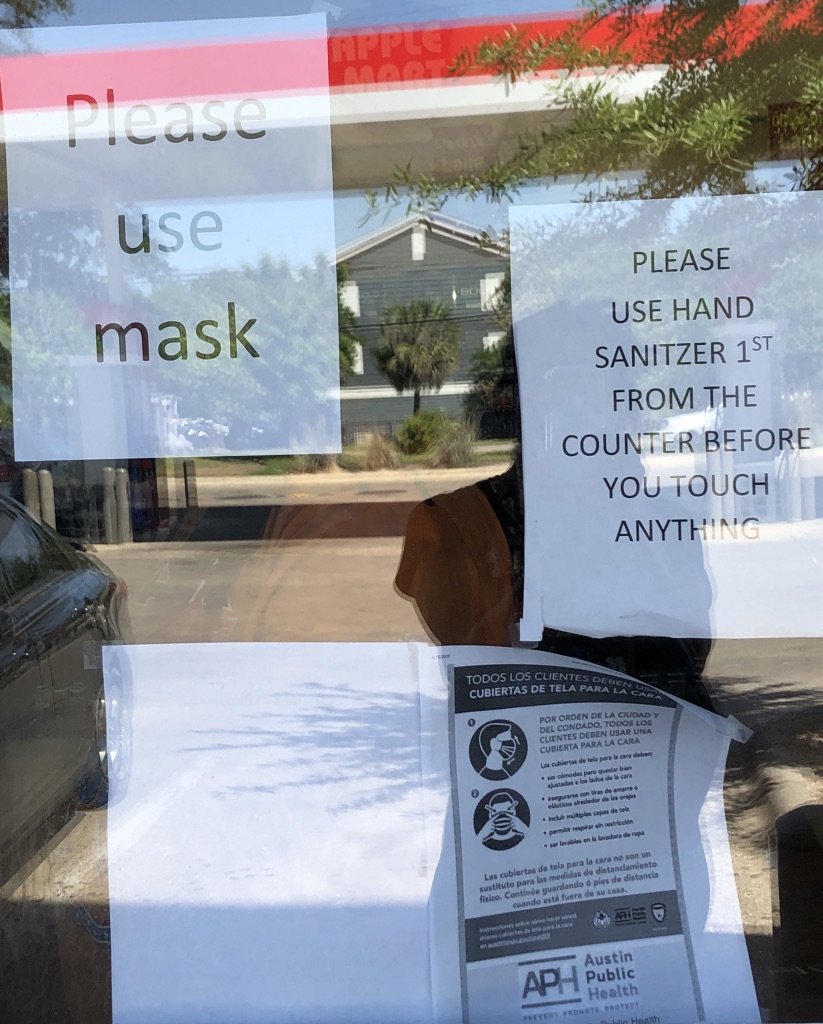 At first the employees wore masks and a plexiglass shield was installed to separate them from the general public. Now these signs appeared, especially since the rethinking about who needed to wear a mask had changed. I’d been gifted a mask right on time.