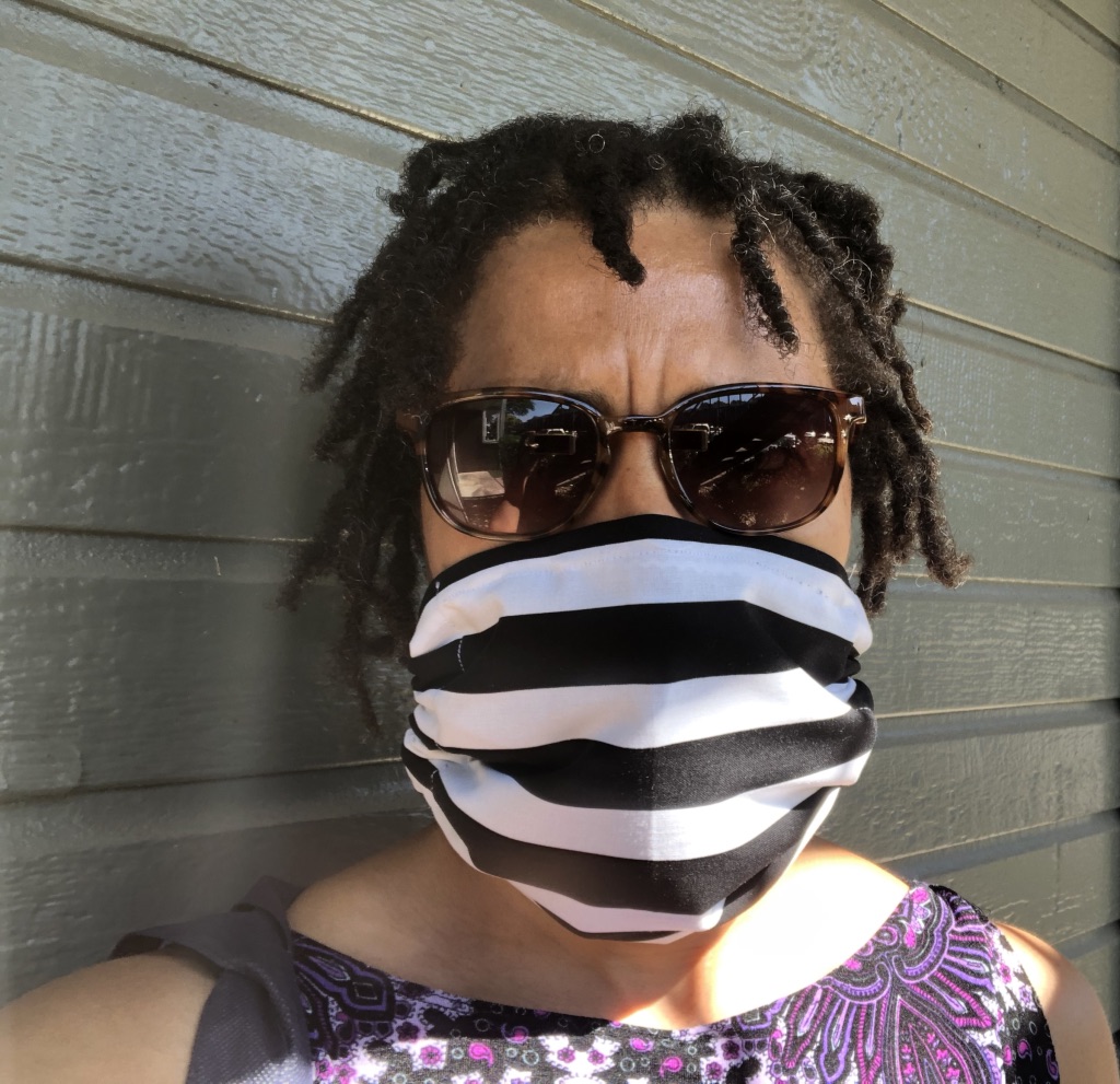 It was a different design. On my first through third attempts, I still hadn’t adjusted it to my face correctly. Unlike the first mask, I had to drape its strap over my head as if it were a facial apron, shape the copper wire across the bridge of my nose, and then adjust the drawstrings at the bottom to tie them behind my head. I fought between having the mask so snug that it crushed my nose and making it so loose that it slipped down my nose. What I eventually figured out was that I needed to first gather my dreads into a ponytail, higher than I normally place it, in order to rest the strap on the ponytail. Then pull the drawstrings to adjust it snugly.