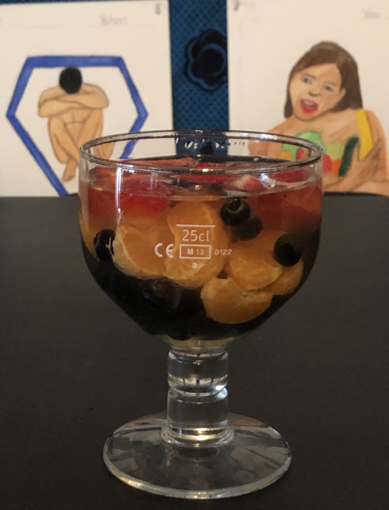 After going to the grocery store, I filled a goblet with fresh fruit: blueberries, strawberries, and mandarin slices. Then I poured the bourbon over it and let that marinate for about 20 minutes as I prepared dinner. Next I added a splash of margarita mix and tonic water. I called it a bourbon fruit cocktail. Leagues better than my first attempt, but still wasn’t quite a go-to drink.