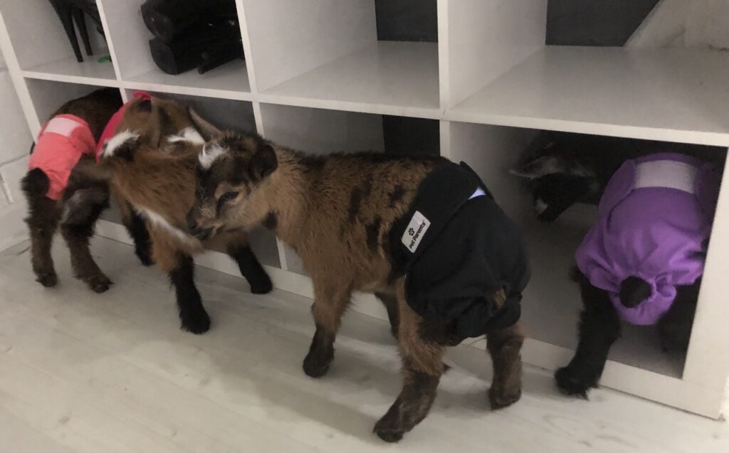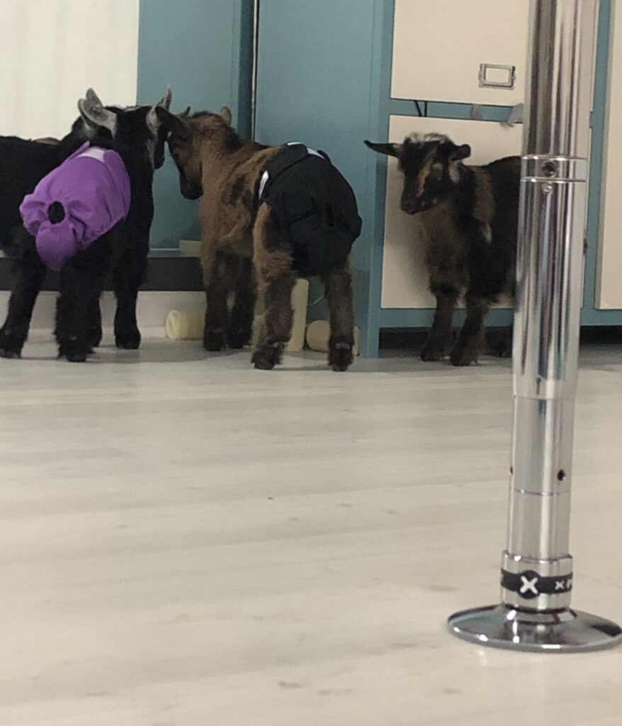 This was the first time in their monthlong lives that they had been inside a building. Initially, their hooves couldn’t find purchase on the smooth floor, but goats are natural climbers and adapt to any terrain. Once they figured out how to walk, their first destination was checking out the cubbies. Didn’t even matter that it was a deadend. Couldn’t blame them though. How often do humans dwell in deadend situations as if we’re doing something?