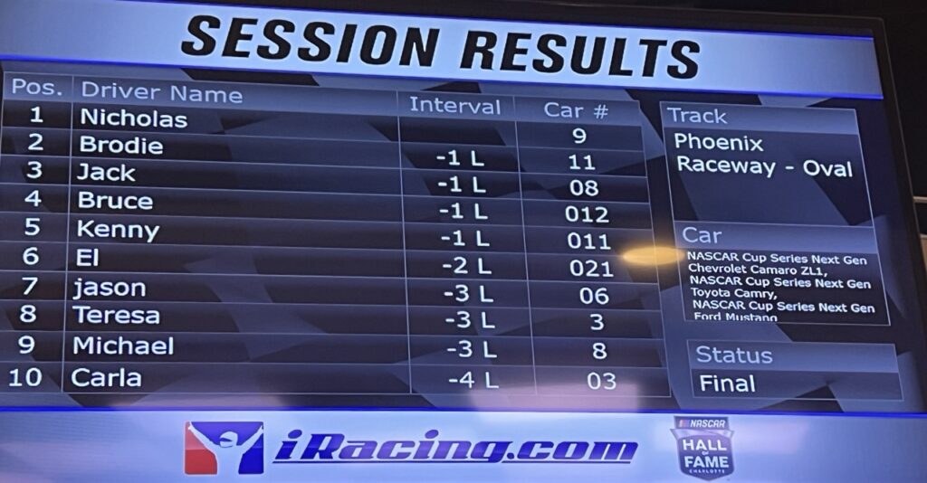 During the simulation, I still didn’t shift gears, but I threw caution to the wind and used both feet to work the gas and brake pedals. I crashed and burned a few times, but at least I beat my sister. As she put it, we placed in the top 10. How optimistic, considering there were 14 drivers.