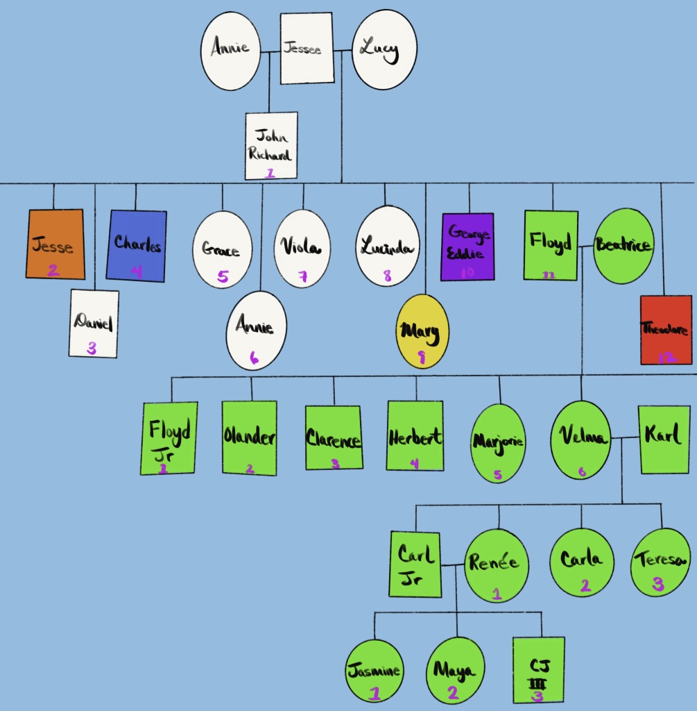 Half of The First Generation of freeborn Stranges had no children and were depicted with a white background. The descendants of the other half of the freeborn First Generation started wearing designated colors at our yearly family reunion, based on their branch of the family tree. For example, my grandfather, Floyd B. Strange, had lime green as his branch color.