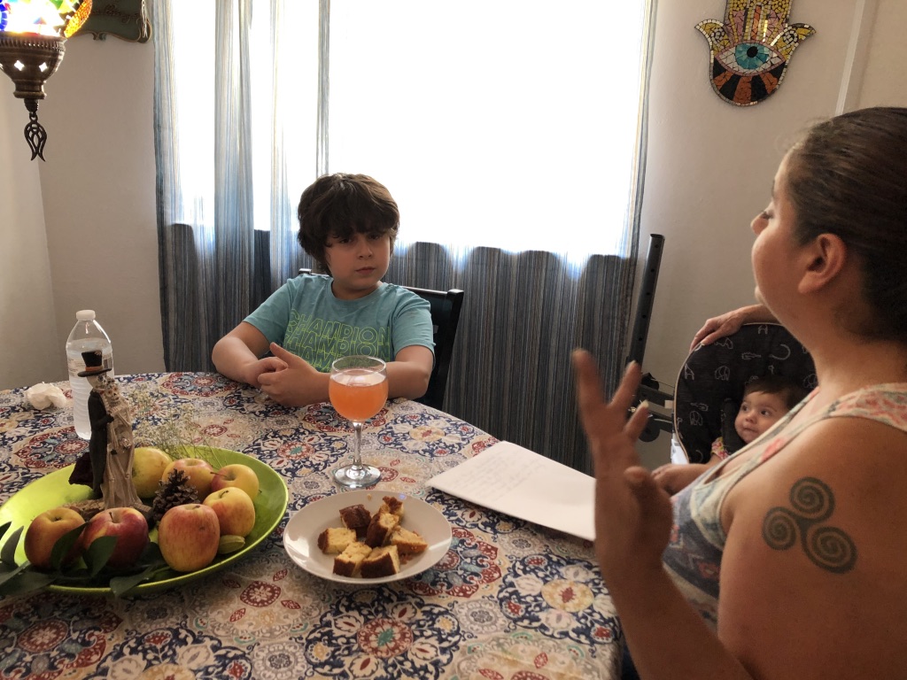 She cut up communion-sized pieces of bread, read a brief description of the observance along with giving thanks for the first harvest, then we all ate a piece of bread. Short and sweet, followed by a sip of strawberry peach mimosa with Proseco–my contribution to the occasion. I didn’t know how this celebration was normally observed, but I knew mimosas went with brunch.