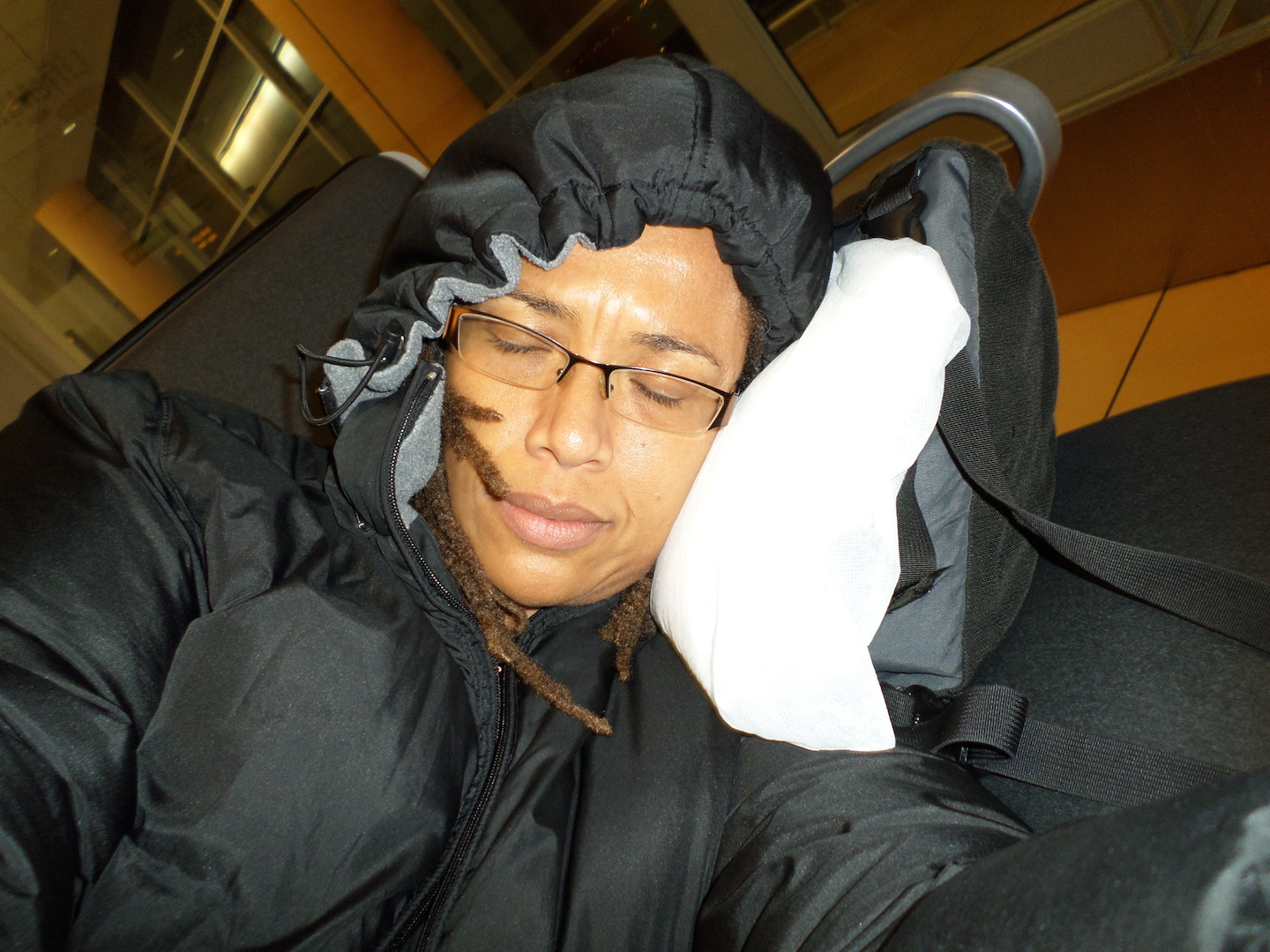 Two flights later, I took a “sleeping selfie” at the airport in Lima. Although my overnight layover was long enough for a nap, PA announcements and airline workers banging on the glass wall to have the door opened by a coworker prevented that.