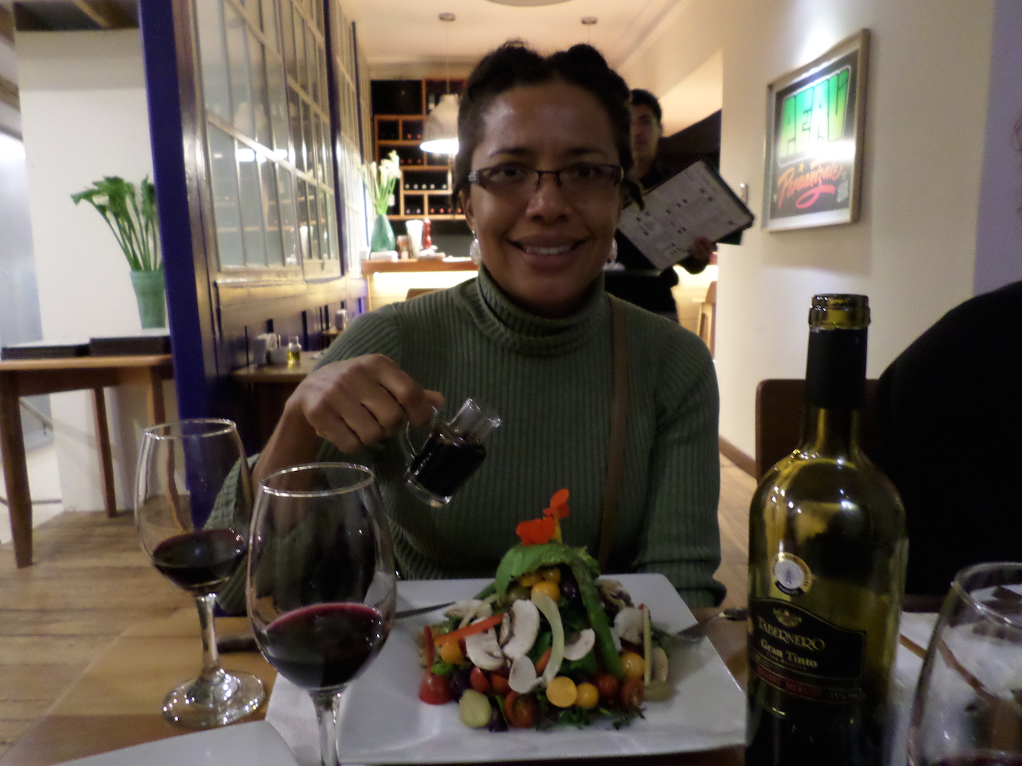 I split a Peruvian malbec and merlot blend at an upscale restaurant to have with the chocolate. Since I wanted a light dinner, I ordered a salad and discovered Peru has the creamiest avocados on earth!