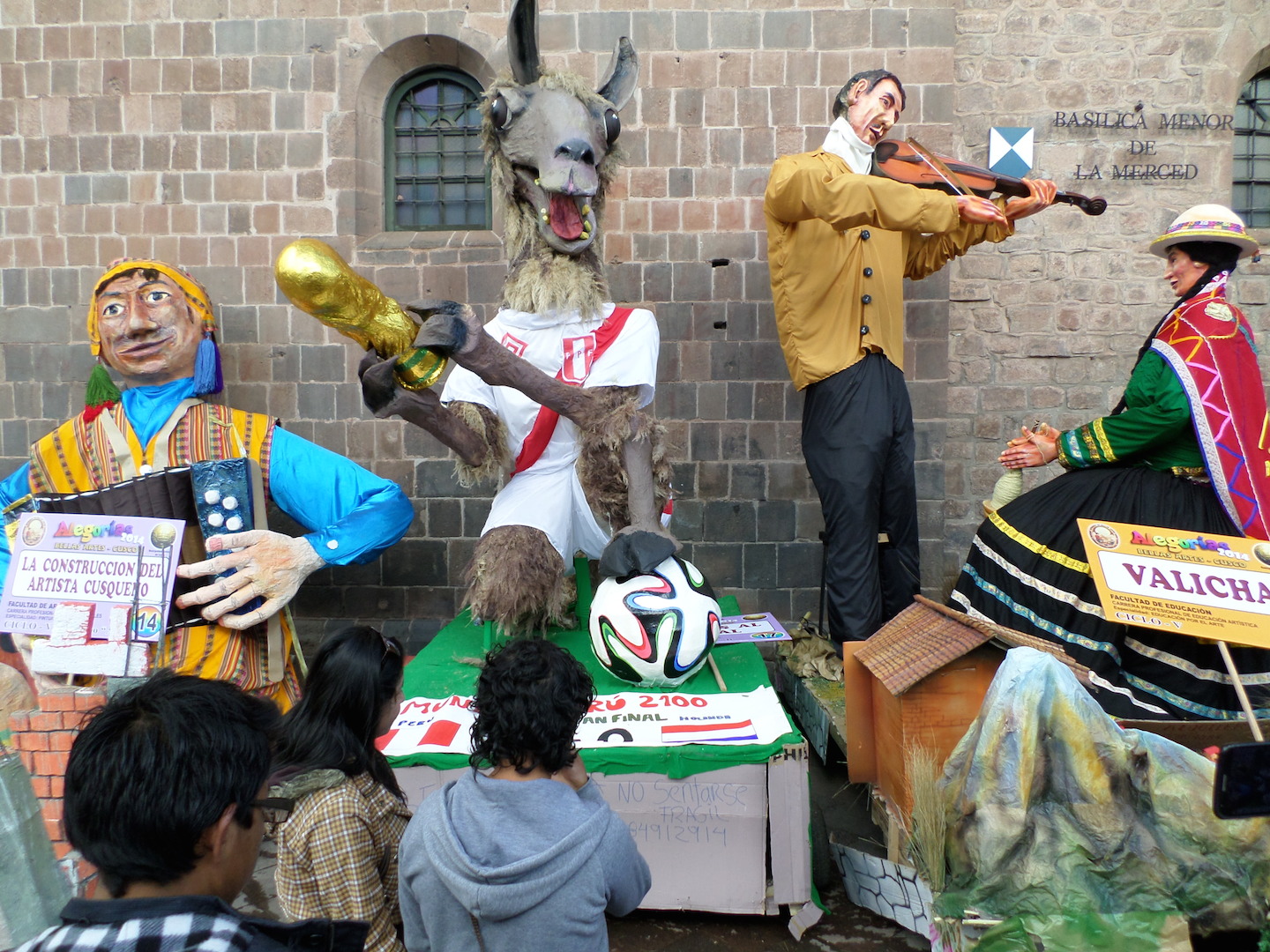 Down an alley branching off the Plaza de Armas, we came upon a series of parade floats. I especially liked this one for incorporating a soccer theme since the World Cup invaded everybody’s mind.