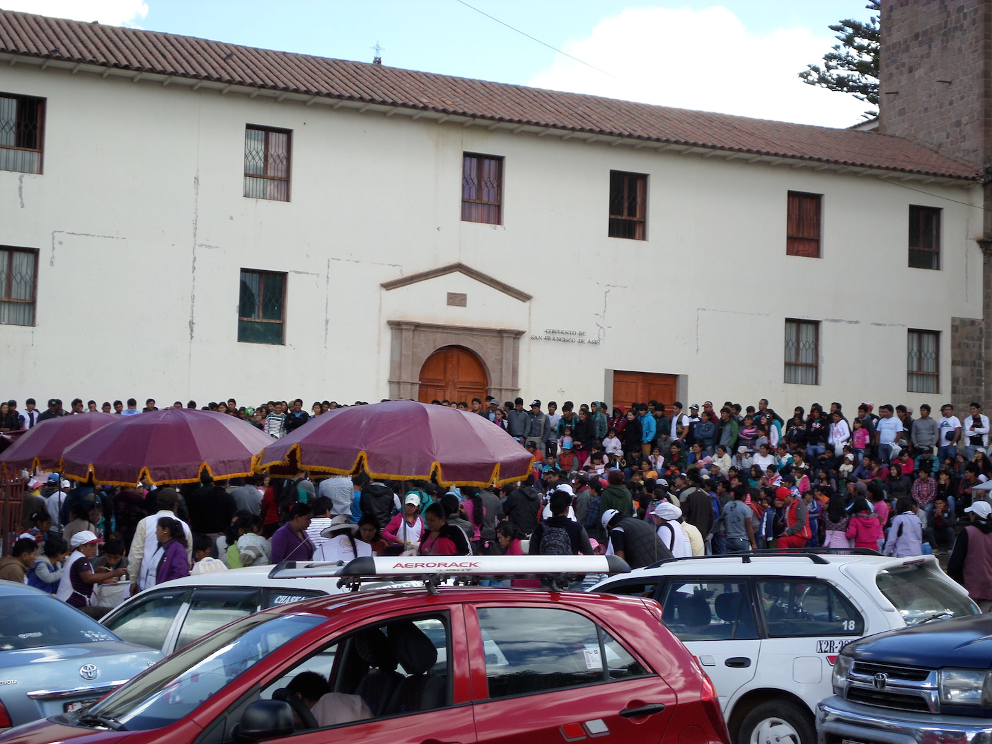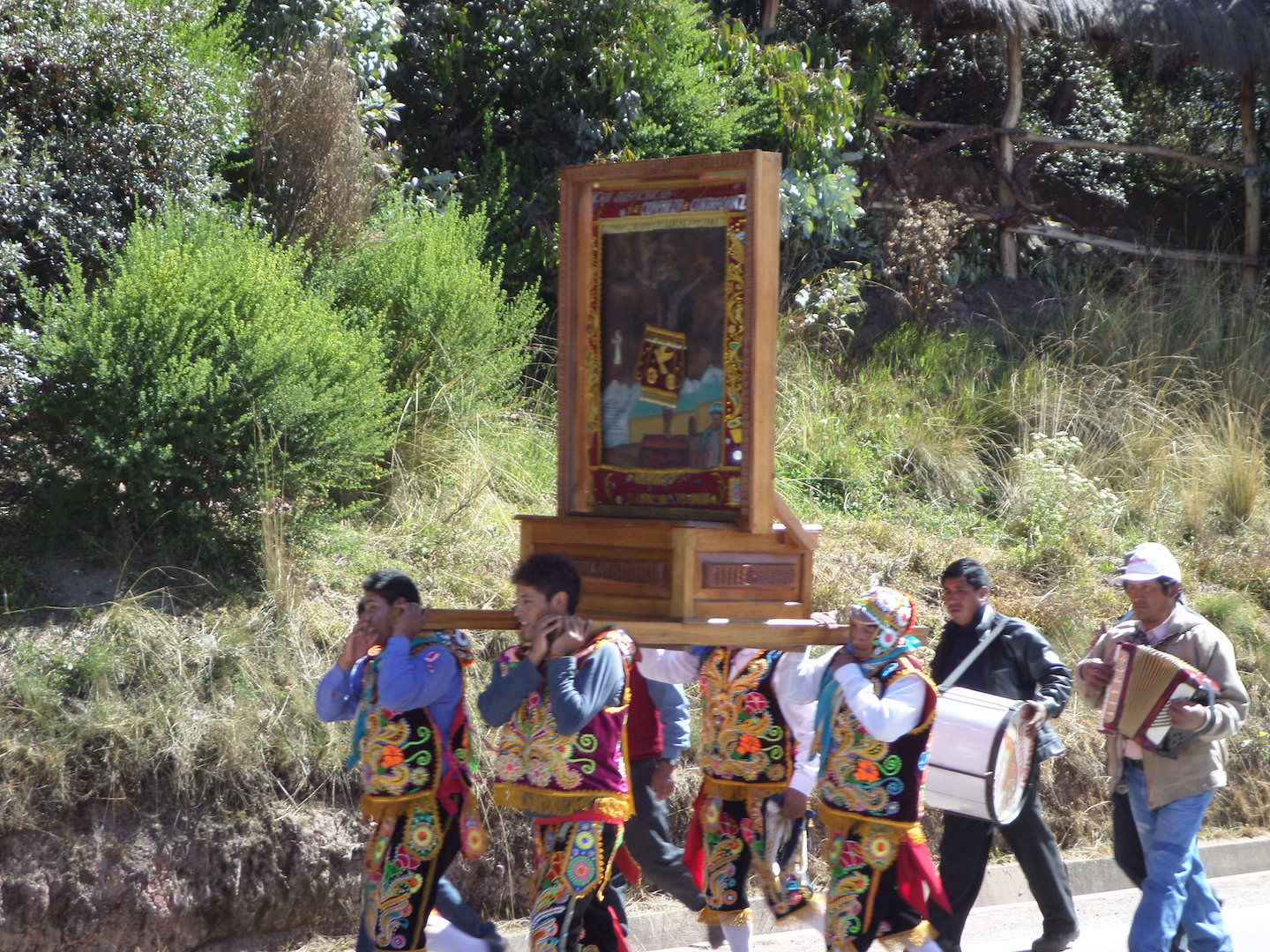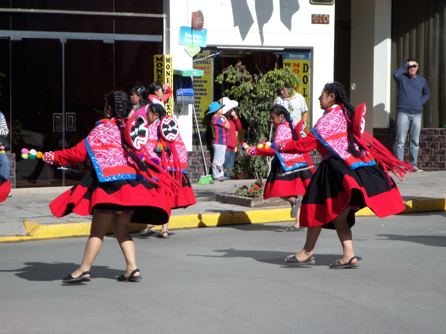 As we took in the ambience of rooftop religious symbols and guinea pig preparation, a parade marched by.
