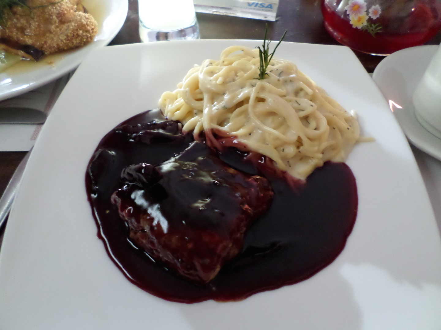 For our first dinner, I ordered alpaca brichra mediterranea, which was served with a berry sauce, sliced figs and cream pasta. Tasted like deer, but with less cholesterol than beef.