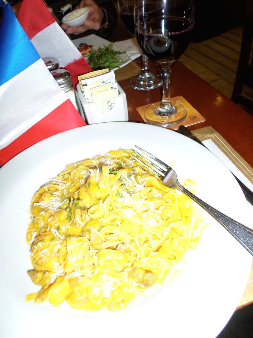 My last supper in Peru was the most expensive, courtesy of the Lima airport. I bit the bullet and ordered Malbec with fettuccine and shrimp. I bought a $3 bottle of water afterwards to counterbalance the saltiness of the sauce.
