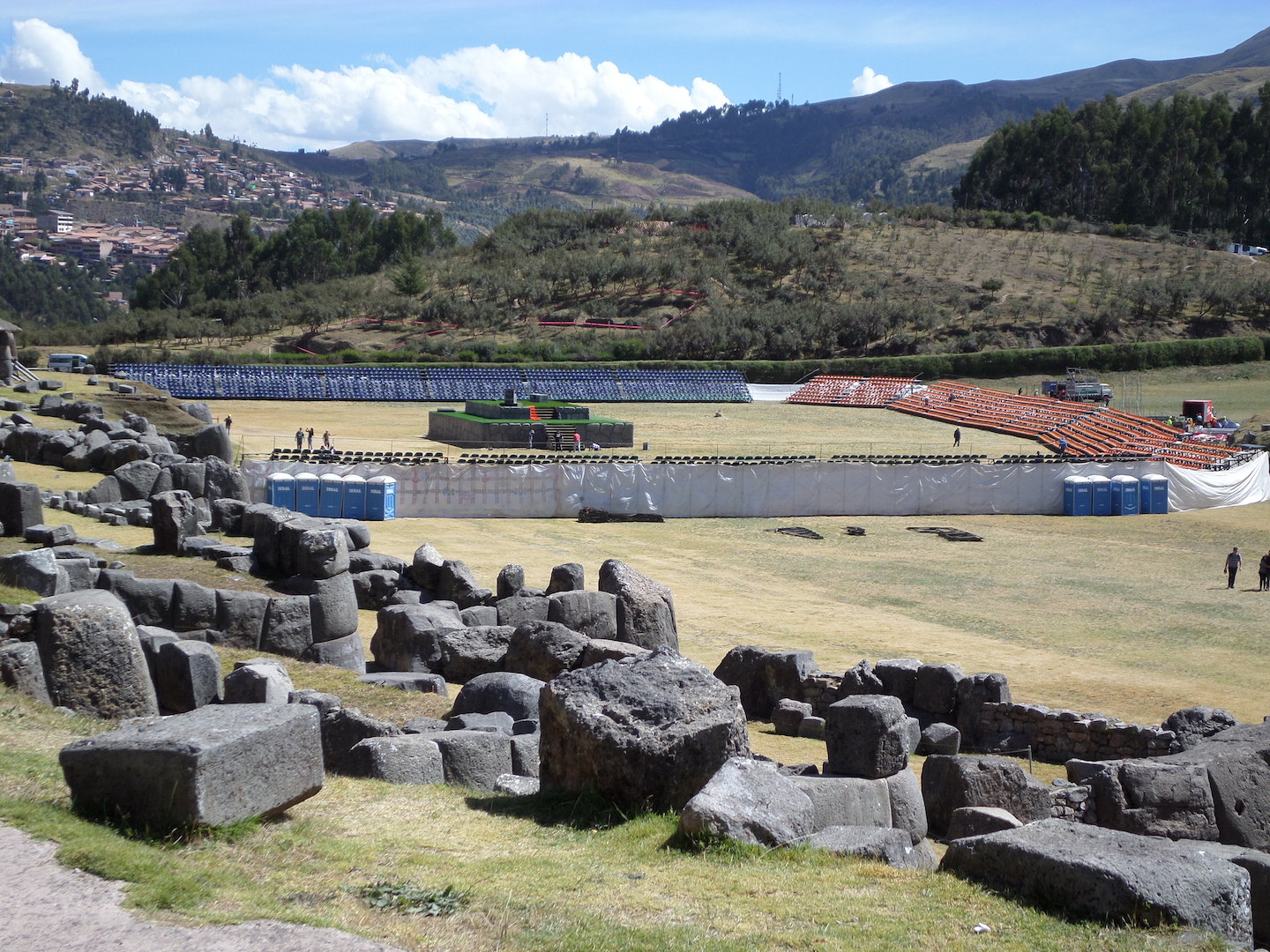 No Cuzco city tour would be complete without visiting Saqsaywaman (pronounced similar to “Sexy Woman”). With retaining walls to prevent mudslides during the rainy season, Saqsaywaman was the site where the Inca would celebrate mother earth by drinking chicha, fermented maize. On August first, a young girl, who had not yet menstruated, was given chicha and coca leaves and buried alive to appease mother earth to prevent natural disasters. The temporary bleachers shown here had been brought in for people who could afford to celebrate St. John’s Day in style.