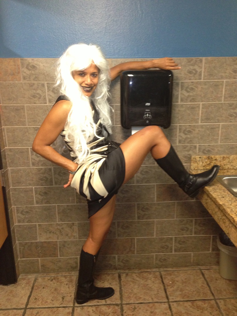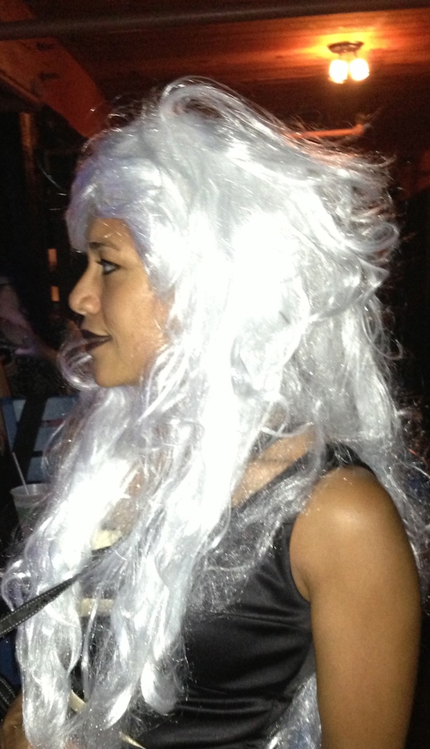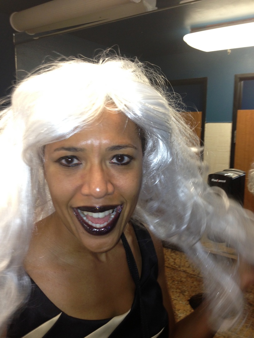I was especially happy when she said that dressing up was involved since Halloween is my favorite holiday. What did not cross my mind, not even once, was that I should dress up in some David Bowie-inspired costume. I think David Bowie would have approved of my attire. Anytime a black woman is motivated to wear a long white wig has to be a great moment–along with the dramatic black and white dress that Mom gave me one Christmas, and topped off with black glittery lip gloss!