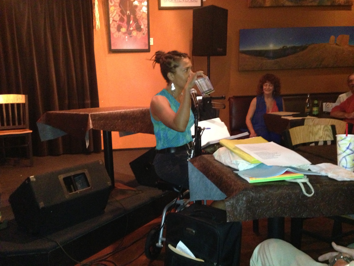 After 4 or 5 featured poets, the open mic round began. During my turn, I started off making a shameless plug for The Austin Writers Roulette. I then read “Amazon Gender,” which is about the modern day heterosexual woman who lives outside societal expectations. I’d never read it at this particular venue where the pieces seem to run more along the sentimental. Yet the piece resonated with many of the older men in the audience.