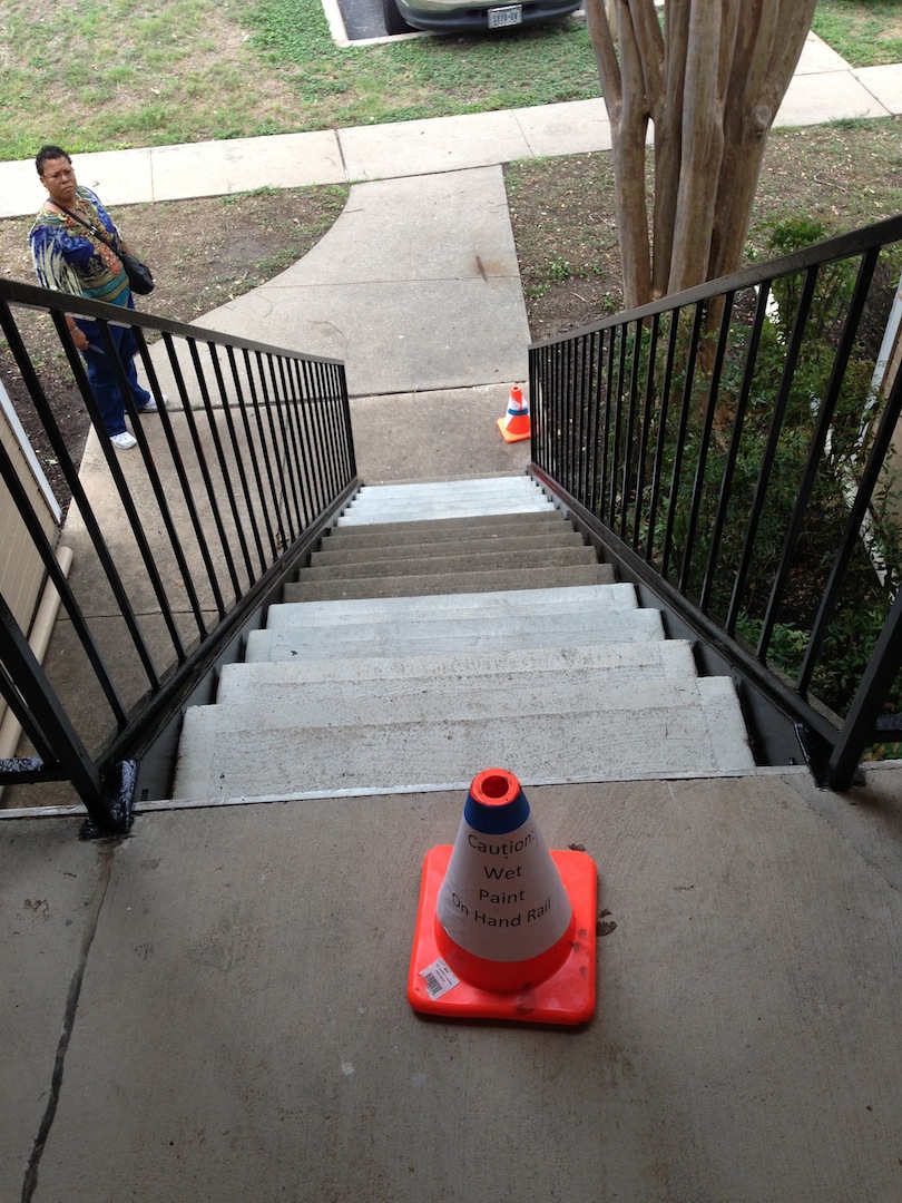 The next morning, I opened the front door of my apartment and all the newfound mobility that I’d gained with the knee walker was shot to hell, discovering that the guys renovating the apartment complex had painted the railing. I’d usually grab ahold of the railing and double up on the crutches on the left and hop down one stair at a time. Thank goodness, once again, my sister was with me. She had to stand on a step below me so I could place and hand on her shoulder and hop down.